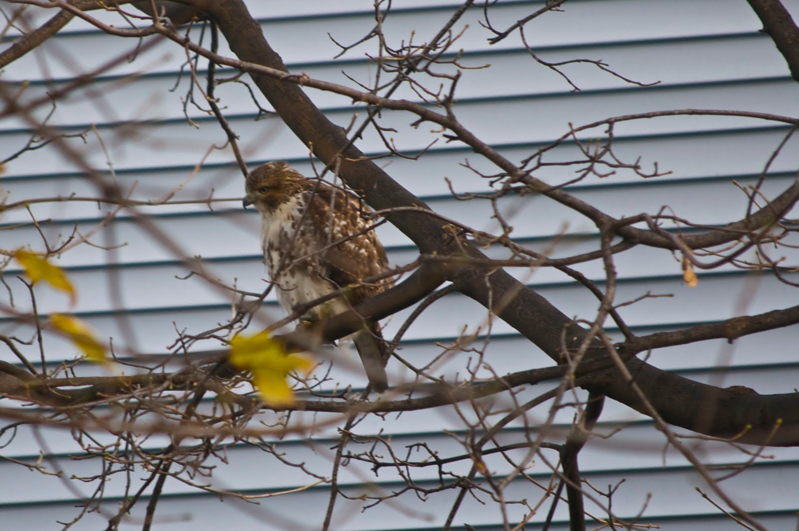 This (I think) is a juvenile red tailed hawk that has been hanging out in our neighbors back yard. I think he's scanning their back wall for rats and mice.